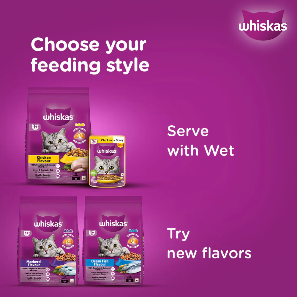 Whiskas Chicken Flavour Cat (Adult 1+) Dry Food is tailored to meet the nutritional needs of cats aged one year and above. Made with real chicken, it provides high-quality protein to support strong muscles and essential vitamins and minerals for overall health. The crunchy kibble helps maintain dental health by reducing plaque.